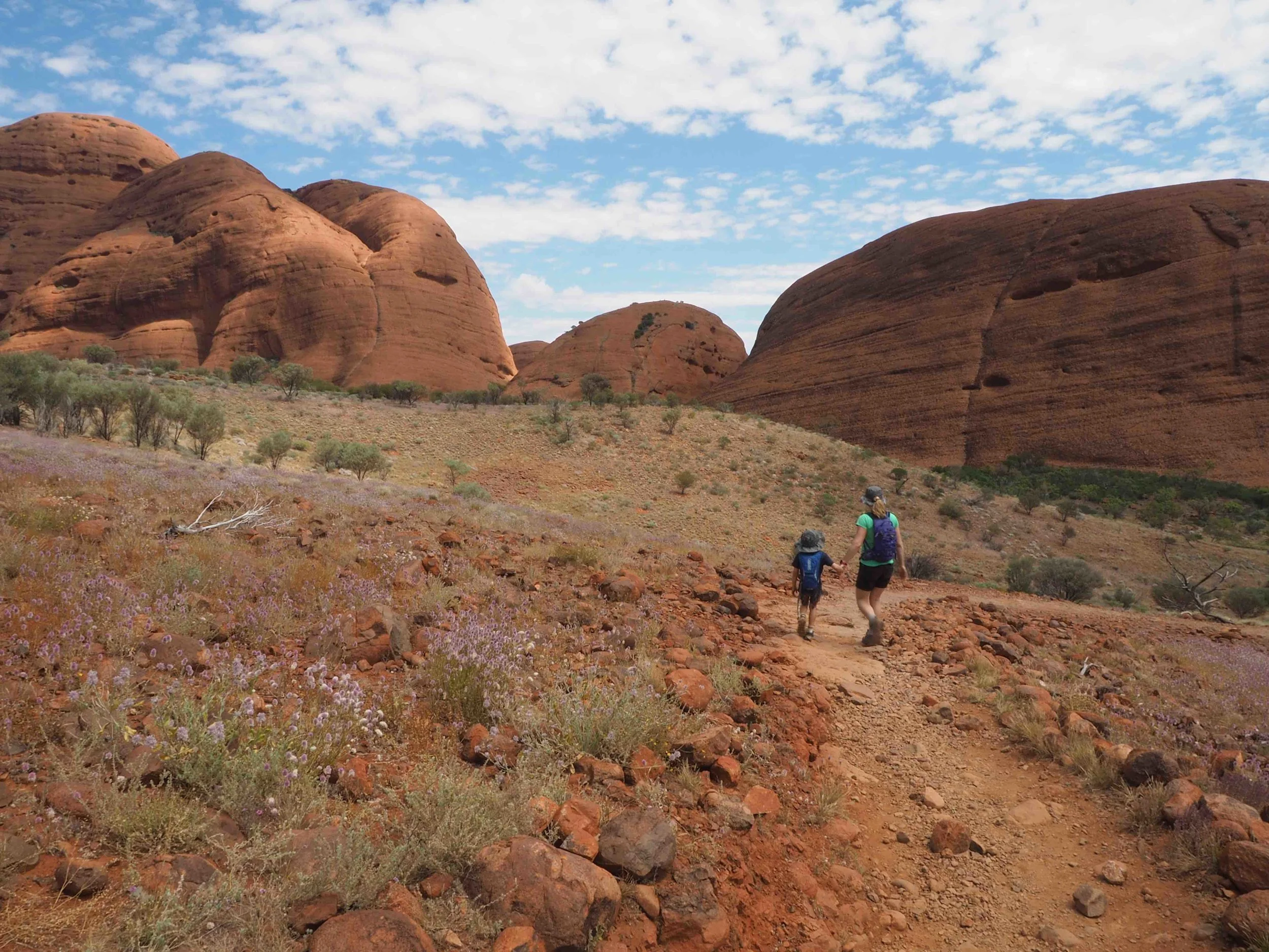 Kata Tjuta was formed the same time as Uluru and it’s many heads look like islands protruding from the even landscape. The Valley of The Winds walk is shorter than Uluru but more demanding as you climb around the sedimentary rock structures and over pebbly ground. The wildflowers were spectacular and the lizards were busy darting along the track and the views around Kata Tjuta were well worth the walk. We were happy to pack up camp in the morning, leaving bustling Yalara behind and make our way to Kings Canyon Station and have a quiet day before attempting our third big walk in four days.
