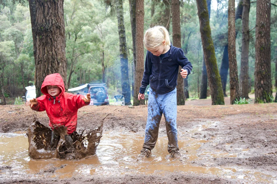 Although I prefer sunshine, some of our most memorable (and the kids best) camp trips have been in the rain. The more mud the better as far as they are concerned and it’s nothing that a bucket shower at camp and a good bath when they get home won’t fix. Finding bugs, climbing tress, getting dirty and playing outside is what being a kid is all about and camping is the perfect opportunity to do all that and more.